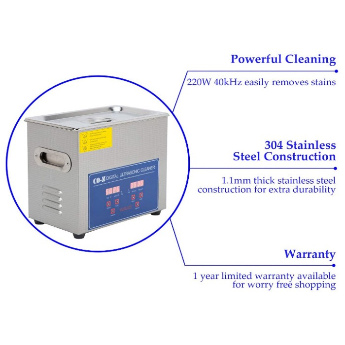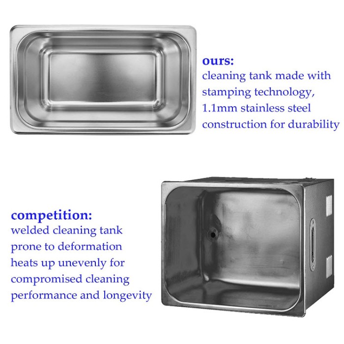 - Large application : conçu avec la technologie la plus récente, ce nettoyeur à ultrasons est un expert en nettoyage, entretien, désoxydation, extraction et plus encore, ce qui aide à répondre aux différents besoins des utilisateurs.