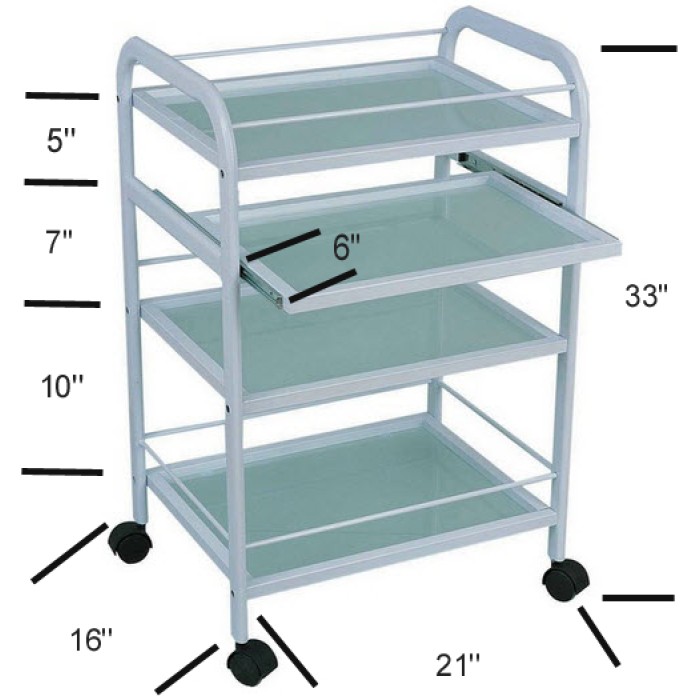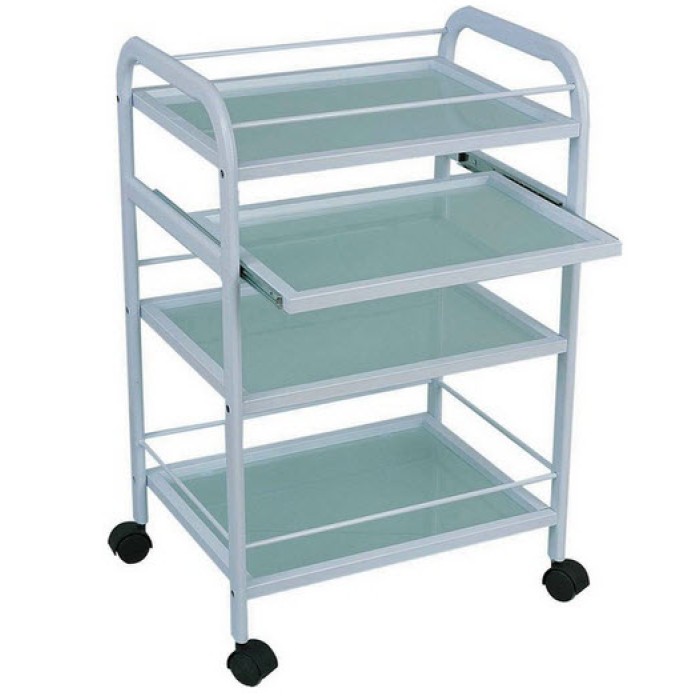 Avec son cadre en métal blanc et des étagères en verre givré, elle donne un aspect propre et intelligent dans un salon, spa de jour, ou cabine de pose d'ongle.