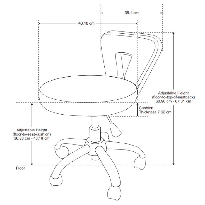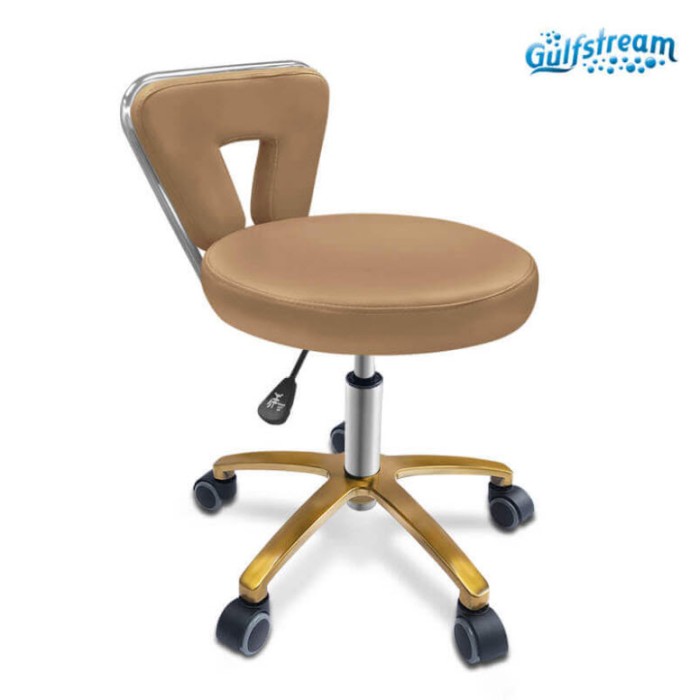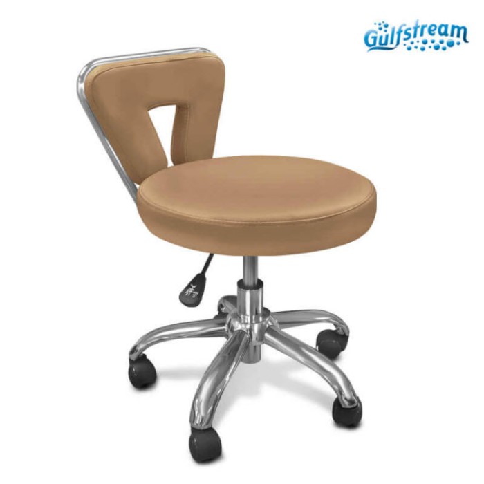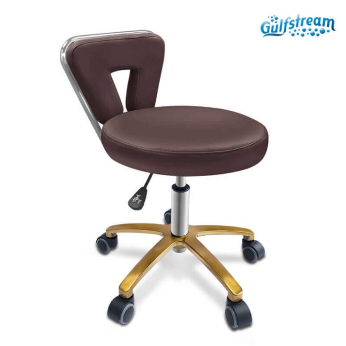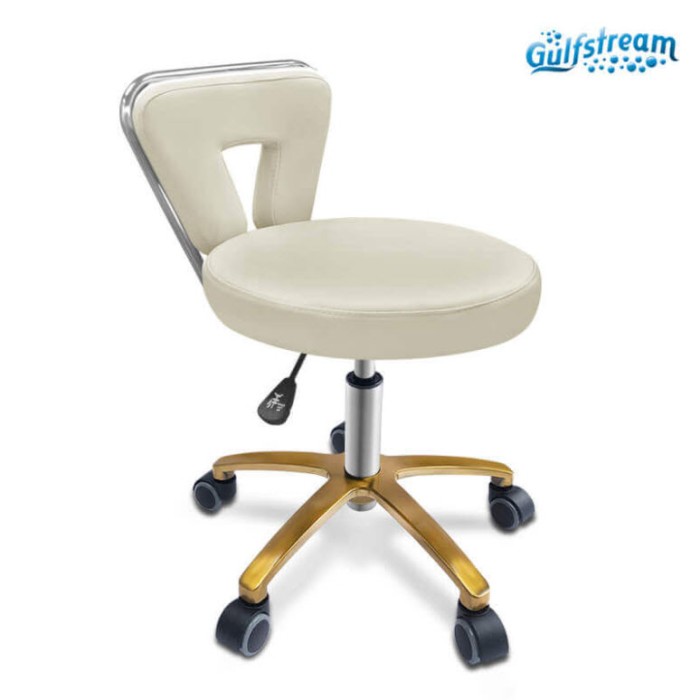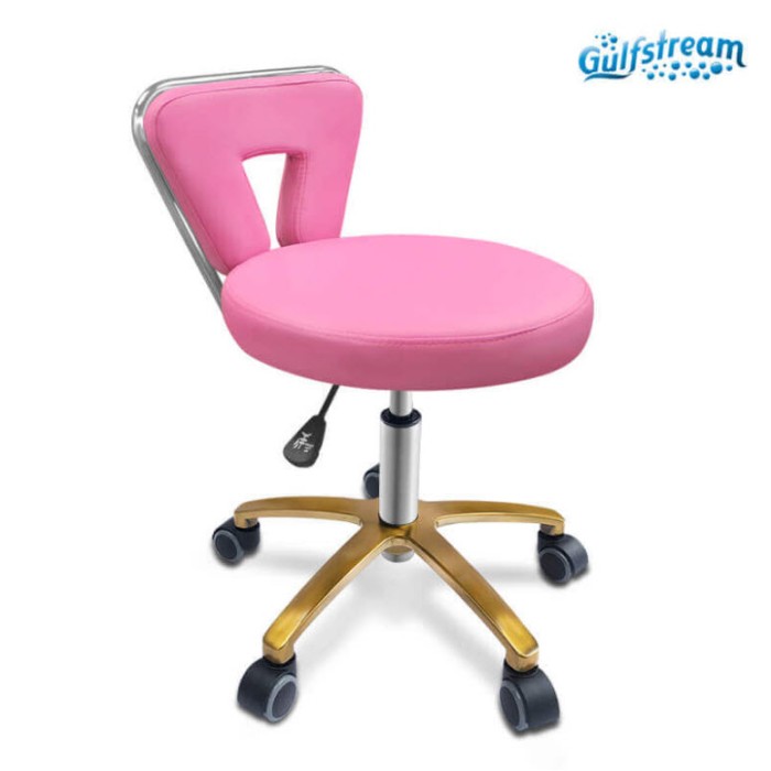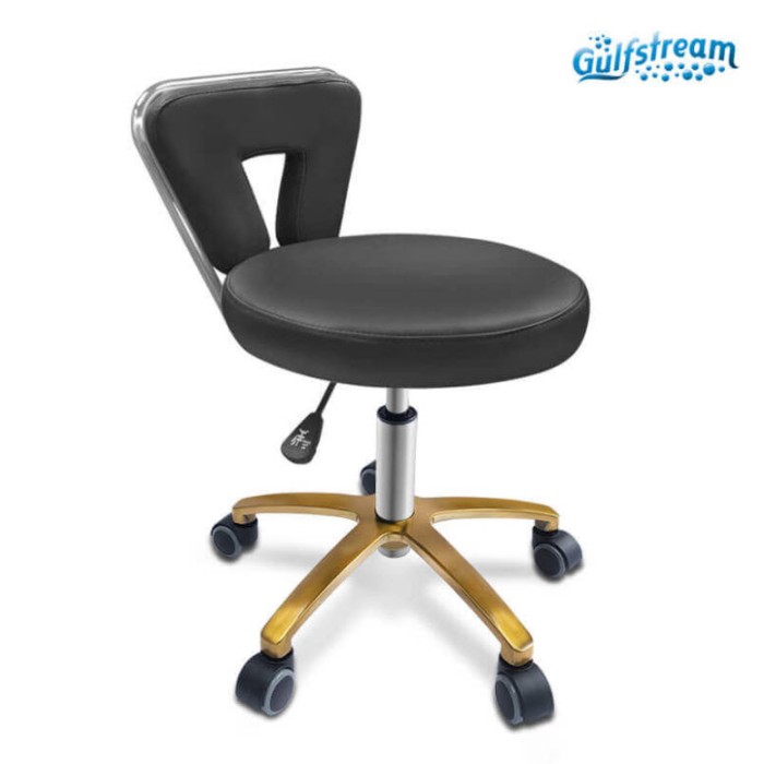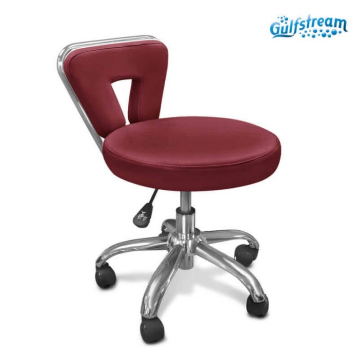 Complétez votre salon avec ce tabouret pneumatique rond, idéal pour pédicure, monté sur cinq roues et munis d'un support du bas du dos triangulaire.