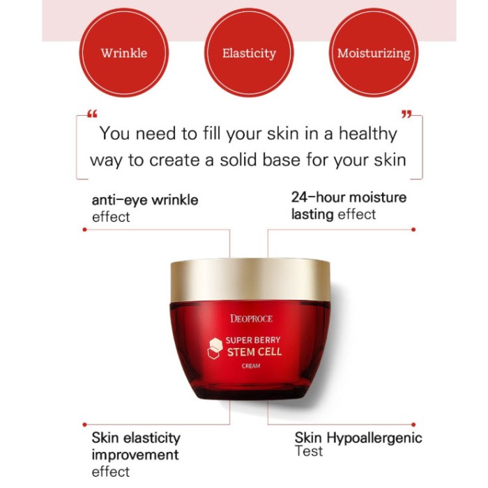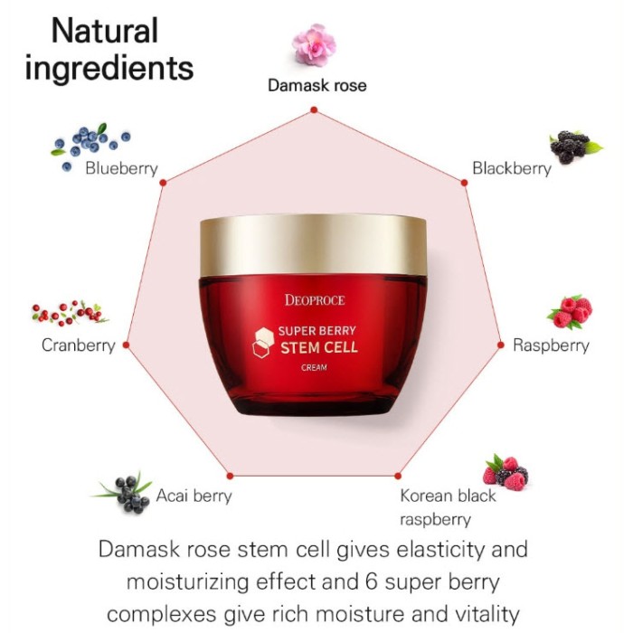 La Crème Deoproce Super Berry aux cellulles souches ''Stem Cell'' favorise l'élasticité de la peau. Ultra-nourrissante, cette crème est enrichie du Complexe Super Berry et d'un extrait de culture de cals de rose de Damas pour nourrir et raffermir votre peau. Elle hydrate et apaise la peau, la laissant douce et saine. Son complexe d'ingrédients, composé de six extraits de baies (myrtille, mûre, canneberge, açaï, framboise et fruit de Rubus coreanus), prend soin de la peau et lui redonne son élasticité grâce à une hydratation intense et revitalisante.