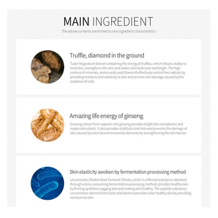 EAU, PROPANEDIOL, BUTYLENE GLYCOL, METHYL GLUCETH20, 1,2 HEXANEDIOL, CAPRYLIC/CAPRIC TRIGLYCERIDE, SORBITAN OLIVATE, CETEARYL OLIVATE, PANAX GINSENG ROOT EXTRACT, TUBER MAGNATUM EXTRACT, SCUTELLARIA BAICALENSIS ROOT EXTRACT, POLYGONUM G MULTIFLORUM ROOT EXTRACT, ANGELICA ROOT EXTRACT EXTRAIT, EXTRAIT DE PHELLINUS LINTEUS, EXTRAIT DE RACINE DE PAEONIA LACTIFLORA, EXTRAIT DE RACINE DE GLYCYRRHIZA GLABRA (RÉGLISSE), EXTRAIT D'ÉCORCE DE MORUS ALBA, EXTRAIT DE RACINE DE CIMICIFUGARACEMOSA, EXTRAIT DE RACINE DE SOPHORA FLAVESCENS, EXTRAIT DE GRAINE DE SESAMUM INDICUM (SÉSAME), FILTRATE DE FERMENT DE RACINE DE LEUCONOSTOC/RADIS, CACAO DE THEOBROMA EXTRAIT DE (CACAO), ALLANTOÏNE, ADÉNOSINE, TROMÉTHAMINE, ACRYLATES/C1030 ALKYL ACRYLATE CROSSPOLYMER, POLYACRYLATE CROSSPOLYMER6, EXTRIN, tBUTYL ALCOHOL, DISODIUM EDTA, PARFUM, ALPHAISOMETHYL IONONE, BENZOATE DE BENZYLE, ITRONELLOL, LIMONENE, HEXYL CINNAMAL, LINALOOL