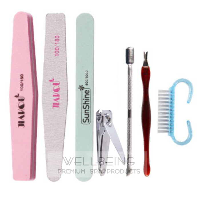 Cet ensemble pour manucure comprend un repoussoir, un nettoyant, une brosse à ongles, un coupe-ongles, une lime à ongles coussinée et un tampon pour vernis à ongles.