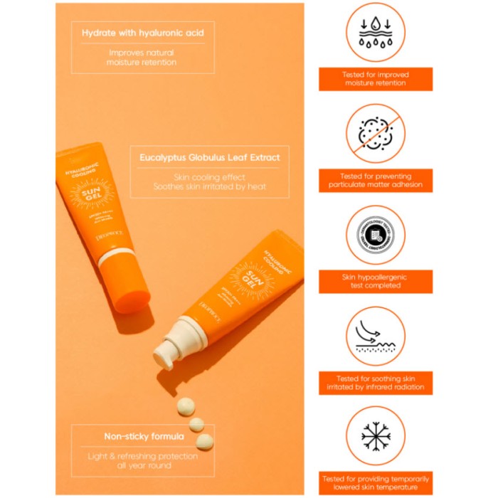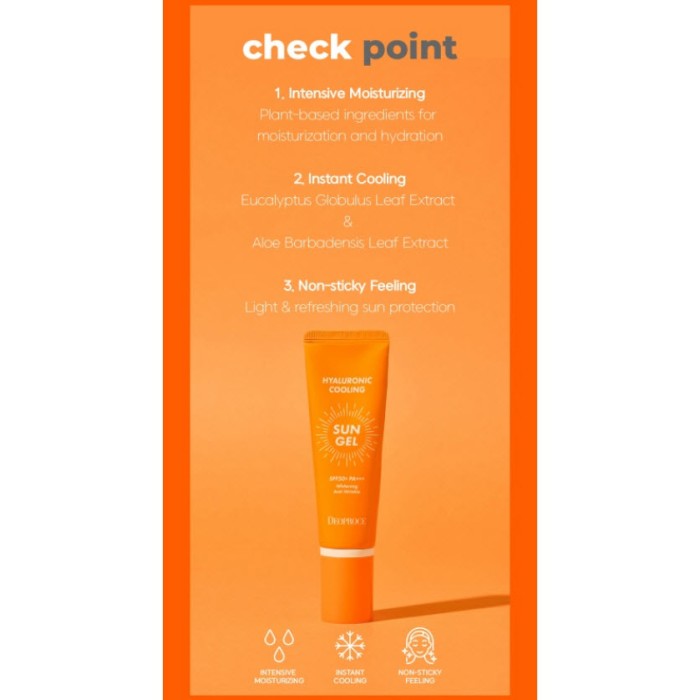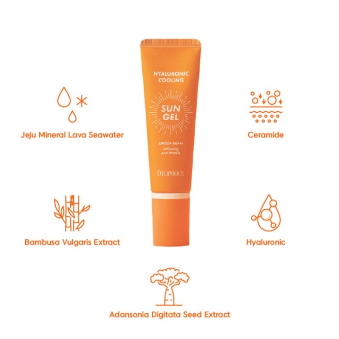 Ce gel solaire refroidissant Déoproce Hyaluronic avec SPF50 + PA +++ a quatre fonctions :